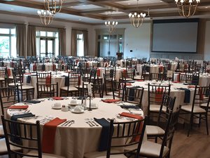 The Grand Ballroom is our largest event venue, suitable for up to 350 guests. From your seat or the spacious deck, soak in the picturesque view of our award-winning golf course and luxurious waterfall. The Grand Ballroom also features a 15’ projector and updated A/V resources – perfect for wedding reception slideshows, birthday party videos, and more.